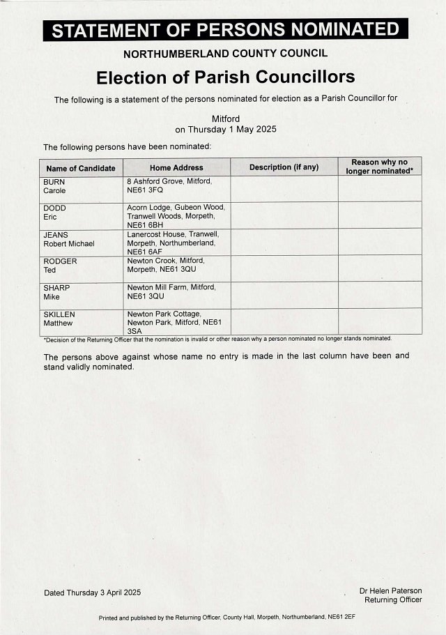 The Parish of Mitford covers an area of approximately 15km₂ in the Northumberland countryside, which includes the villages of Mitford and Tranwell as well as hamlets in Tranwell Woods, Gubeon, Edington and Mitford Steads. The Parish has a population of roughly 450 people and around 200 dwellings. Within the parish, there is a Church, a village hall, a pub, two equestrian facilities and a family golf centre amongst other small enterprises.