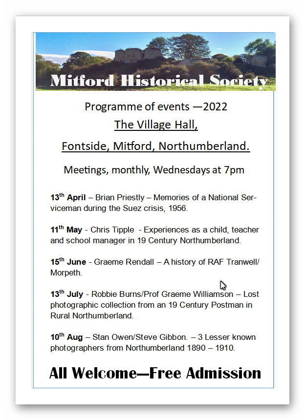 The aims of the society are to stimulate public interest within Mitford and in the county of Northumberland; we also gather and preserve documents, photographs and objects relating to Mitford. We hold the Canon McLeod Photograph albums, which are on display in St. Mary Magdalene Church Mitford, during the months of July to August. A small archive can be made available for members’ research and is frequently on display in the village. Research is ongoing by several members with a specific interest in aspects of the past.
