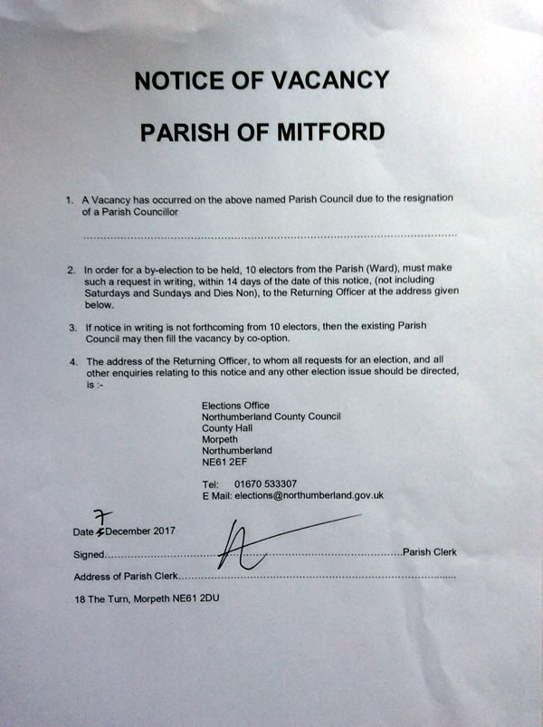 A vacancy has arisen on the Mitford Parish Council due to the resignation of a Parish Councillor. Please see here for more details.